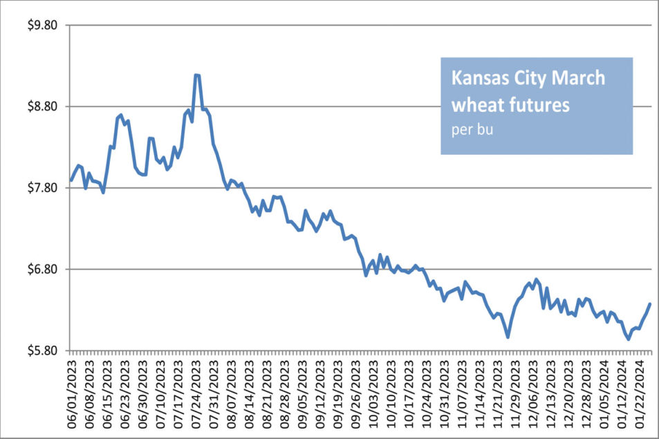 - Wheat futures continued to climb Thursday on optimism that North America and Europe could pick up some global demand amid geopolitical tension in the Middle East and terrorism in the Red Sea. Soybean futures declined Thursday after the USDA said export sales of US soybeans in the week ended Jan. 18 were 560,900 tonnes, below a range of trade expectations for 700,000 to 1,200,000 tons. Corn futures were lower under pressure from ample US inventories, uncertain demand and spillover weakness. The March corn future fell ½¢ to close at $4.51¾ per bu. Chicago March wheat added 1½¢, closing at $6.12¼ per bu. Kansas City March wheat jumped 11¼¢ to close at $6.37 per bu. Minneapolis March wheat added 4½¢ to close at $7.09 per bu. March soybeans deleted 17¼¢ to close at $12.23 per bu. March soybean meal fell $5.10 to close at $358.20 per ton. March soybean oil dropped 0.79¢ to close at 46.53¢ a lb.