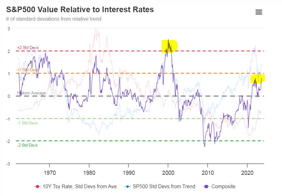 One criticism of the Buffett Indicator is it does not incorporate interest rates, which are a huge influence on asset prices. Fortunately, Current Market Valuation has other models that do use interest rates. One model takes the relative value of the S&P 500 against the relative value of the ten-year Treasury rate. This is done by taking the standard deviation of the S&P 500 and deducting the standard deviation of the ten-year Treasury rate.