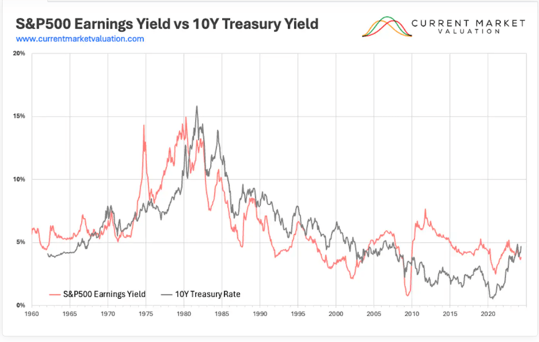 Another comparison is to look at the earnings yield of the S&P 500 against the ten-year Treasury rate. The earnings yield is the return on investment that an investor can expect if earnings were to not grow and are calculated at an inverted rate of the P/E ratio (for example, a PE ratio of 20 would coincide with an earnings yield of 5%). The earnings yield of the S&P 500 is currently below 4%, which is abnormally low and shows that the S&P 500 has been appreciating at a faster rate than earnings growth.