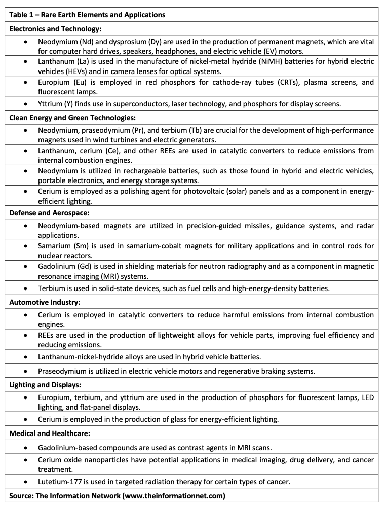 If China restricts rare earth element (“REE”) exports, it would affect industries worldwide that rely on these elements and applications as shown below in Table 1: