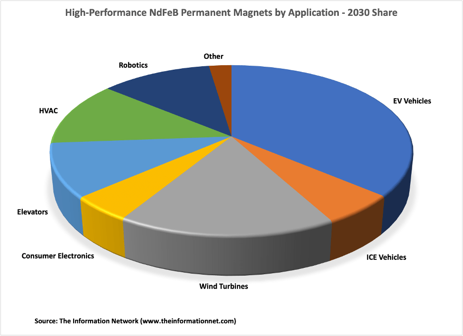 According to The Information Network’s report entitled Rare Earths Elements in High-Tech Industries: Market Analysis and Forecasts Amid China’s Trade Embargo, in 2030 Green Technology applications (EVs, Wind Turbines) will dominate the demand for REEs as shown in Chart 1.