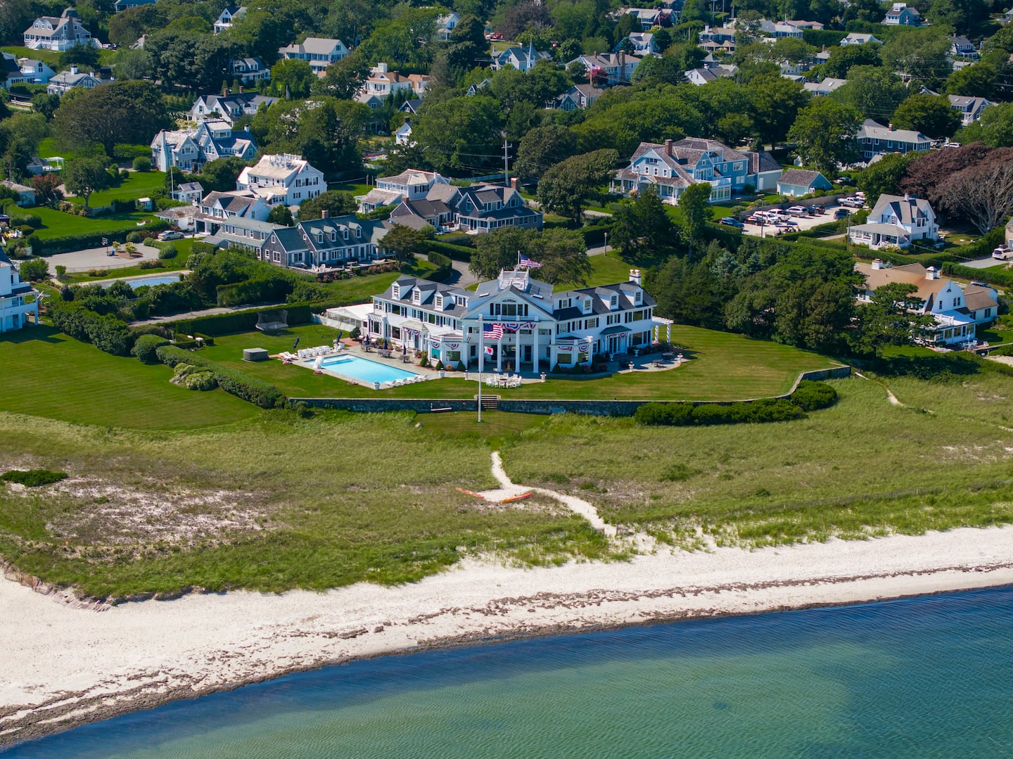 He said some of the property’s outstanding appeals include a widow’s walk roof deck, a custom-designed swimming pool, close to 500 feet of private beach, a wedding lawn that can hold more than 700 people, and privacy measures of tall hedges and gated driveways.