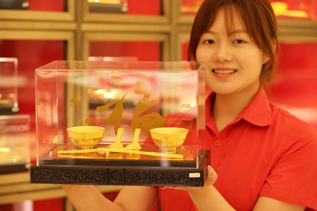 An employee shows gold ornaments at a jewelry firm”s display hall in Hangzhou, Zhejiang province. NI LIFANG/FOR CHINA DAILY
