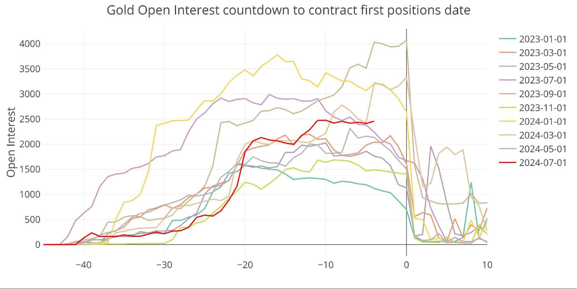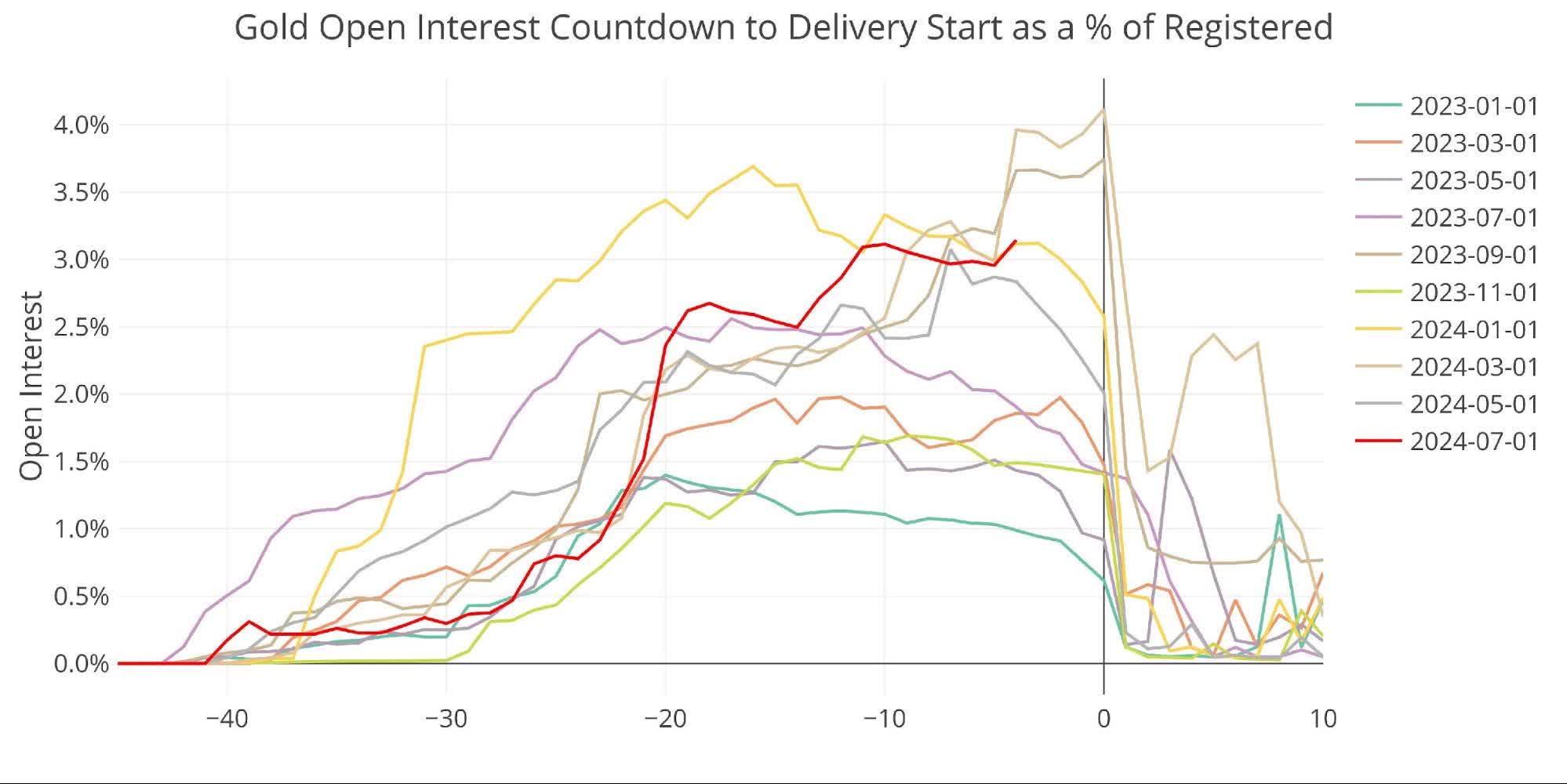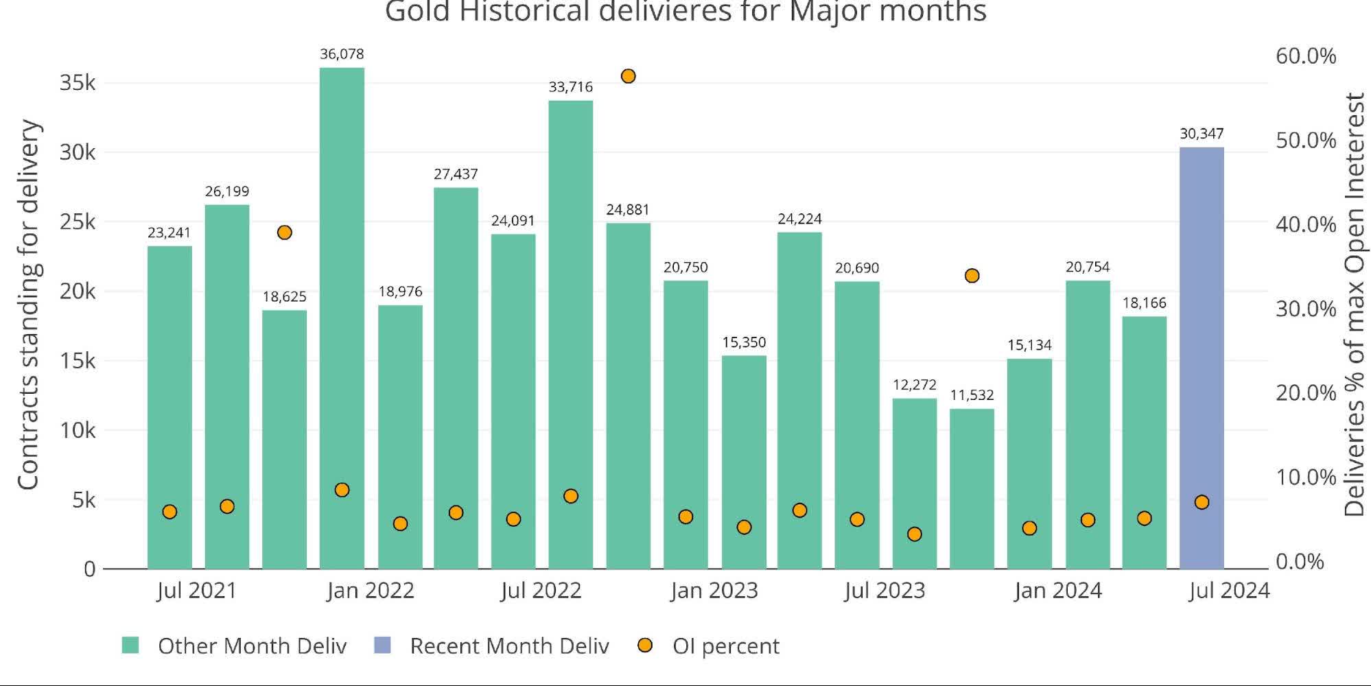 The analysis last month showed open interest in gold at well above trend. That trend held into the delivery period. June is a major delivery month in gold and saw more than 30k contracts stand for delivery. This was the largest delivery volume since August 2022 by a wide margin.