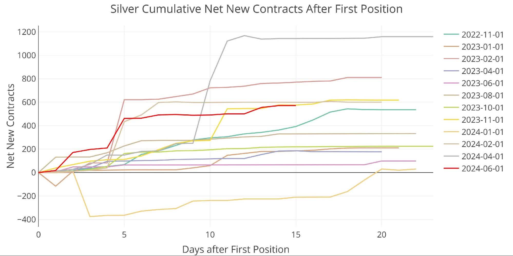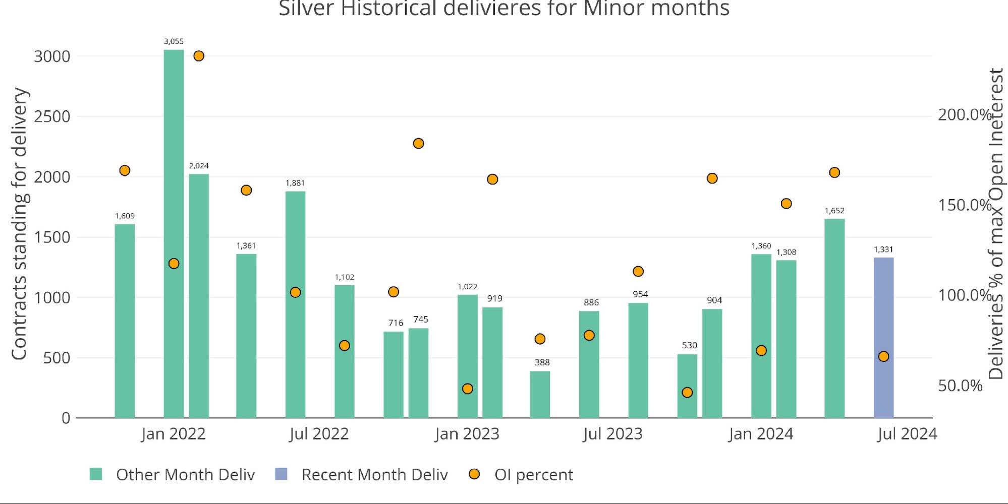 June silver saw a modest 1,331 contracts stand for delivery. June is a minor month in silver, but the chart below shows how activity in silver has definitely picked up after a pretty quiet 2023.