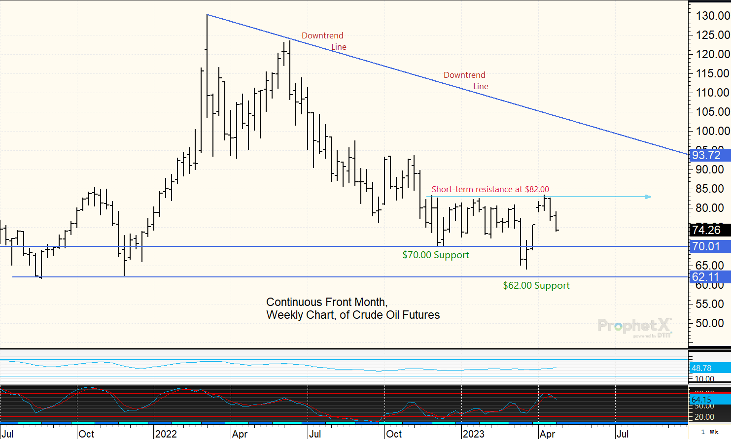 Crude oil futures have traded in a fairly consistent trading range so far for 2023. Fundamentals for the moment seem to be well balanced, keeping prices, for the most part, stable. Nearby futures contracts have mostly stayed in a $12.00 range where $82.00/barrel has been resistance on daily and weekly charts, with $70.00 as price support.