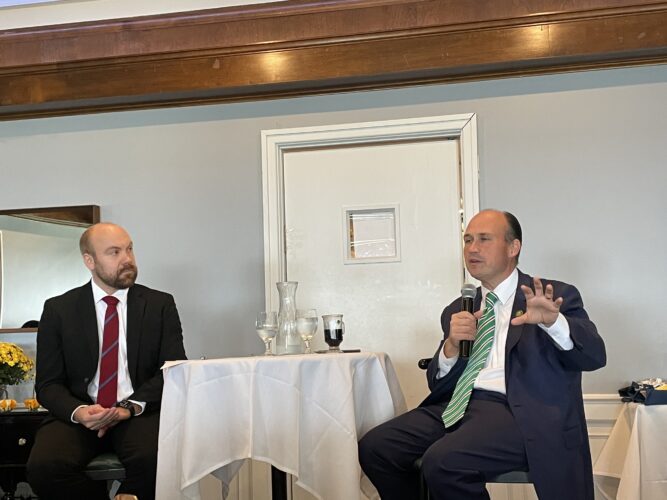 District dilemmas: Langworthy addresses population loss, energy at luncheon | Natural Gas By admin On Oct 4, 2024 4 0 OBSERVER Photo by Gregory Bacon Pictured from left are CHQ Chamber Chief Executive Officer Dan Heitzenrater and Rep. Nick Langworthy.