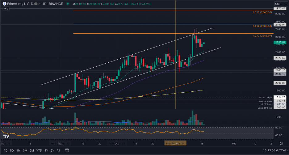 The cryptocurrency remains bullish as it trades inside a rising price channel, with traders predicting a break toward the upside will result in a run toward the $3,000 level.