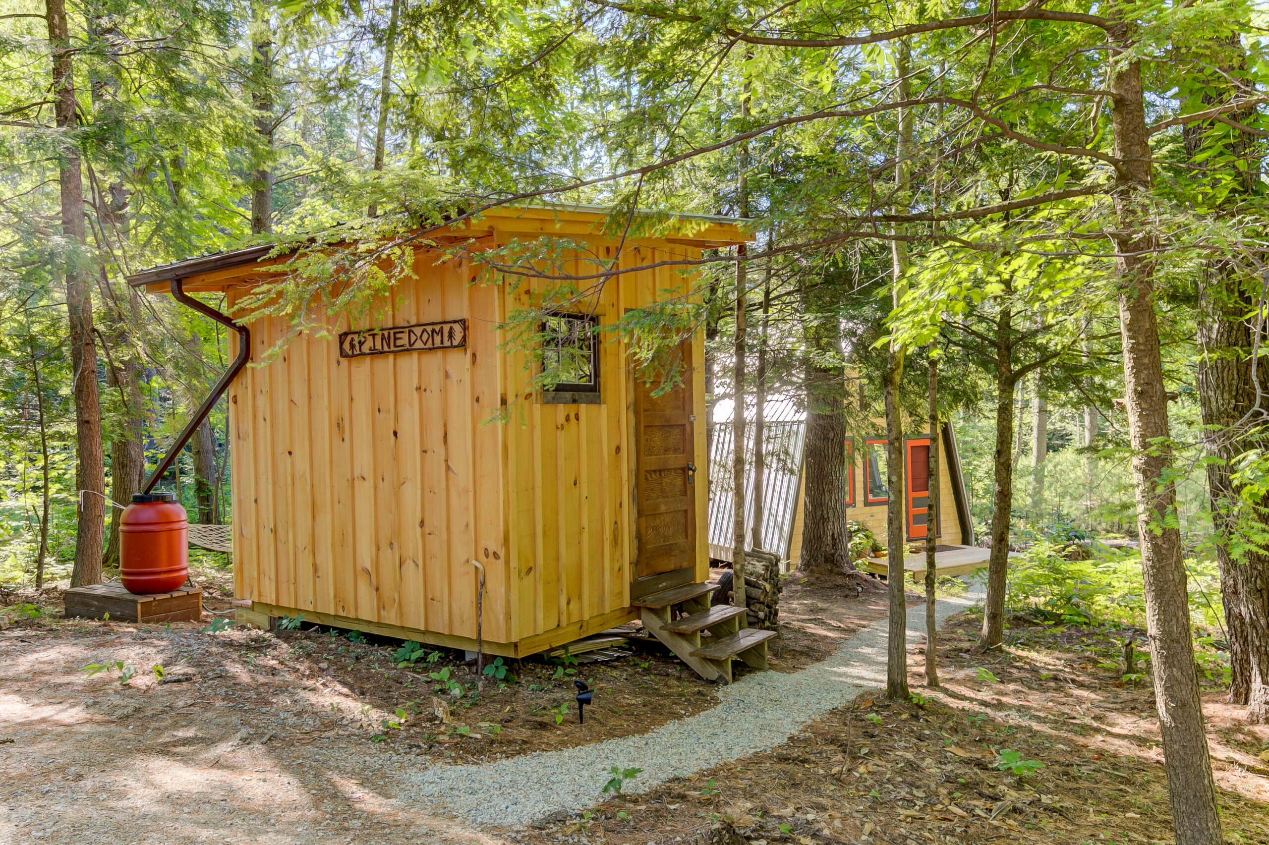 About 20 feet away, you’ll find the bathhouse/privy, cheekily emblazoned with a sign that reads “Pinedom.” Elegantly built with custom woodworking, it’s home to a shower, compost toilet, sink, and an additional storage shed that’s attached.