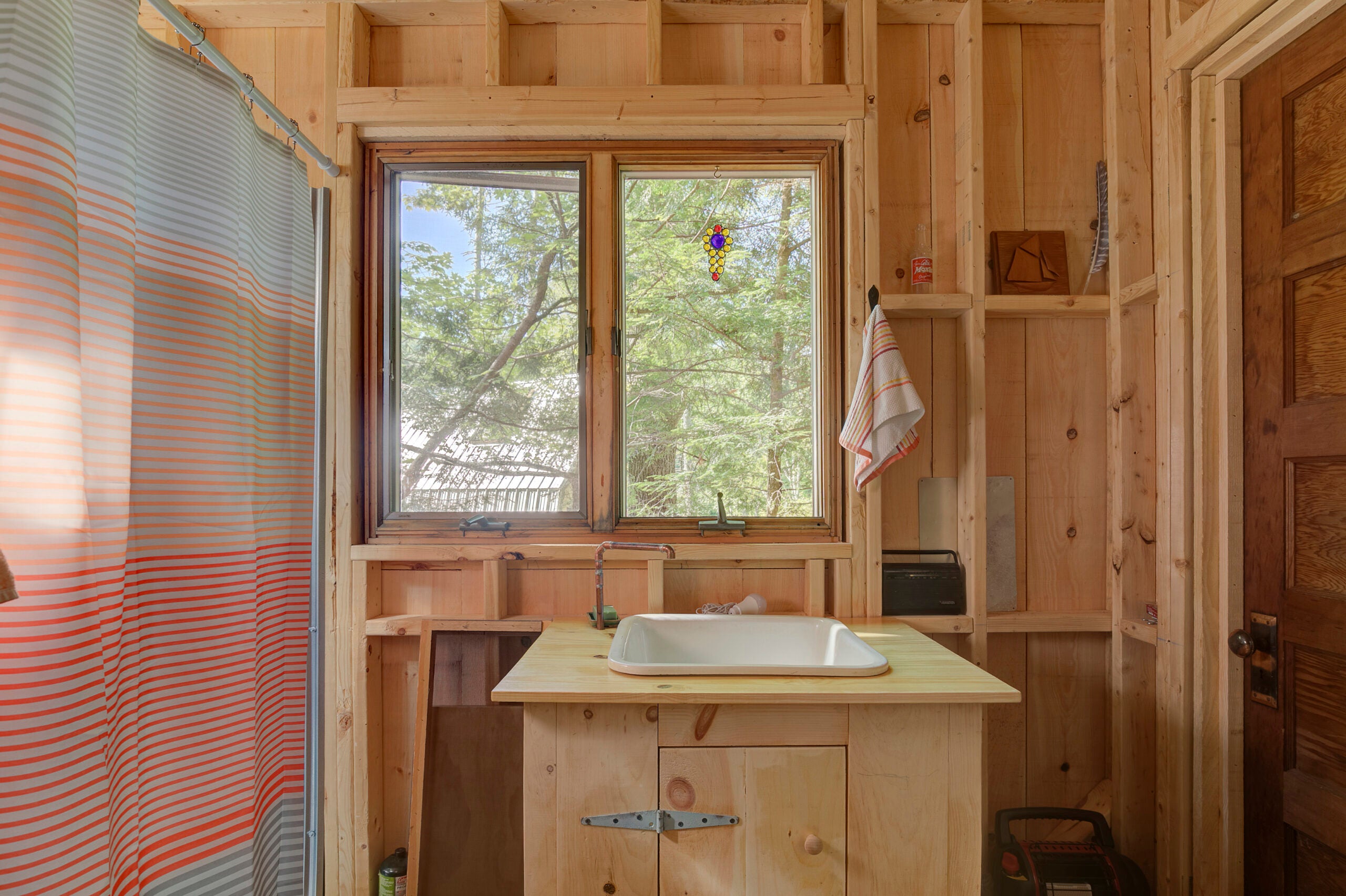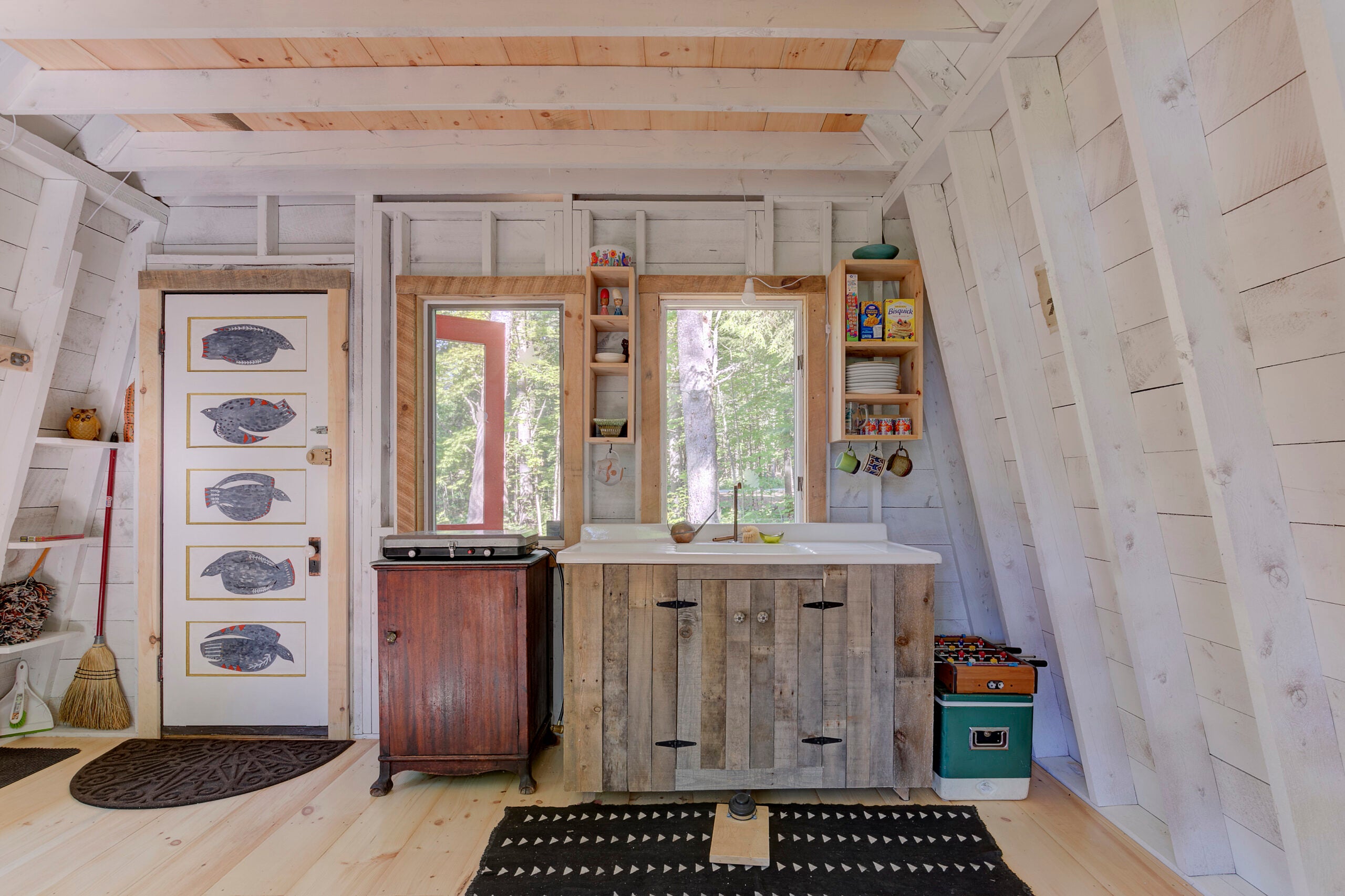Step inside the picturesque red front door to the open-concept living space and kitchen area, boasting wide pine flooring and several windows that provide views of the stream and beaver bog. To the left of the entrance is a kitchen area, which features an old ice chest with a cooktop on top of it, built-in shelving, and a farm-style sink with a custom base cabinet. The kitchen has foot pump water which is collected in a rain barrel.