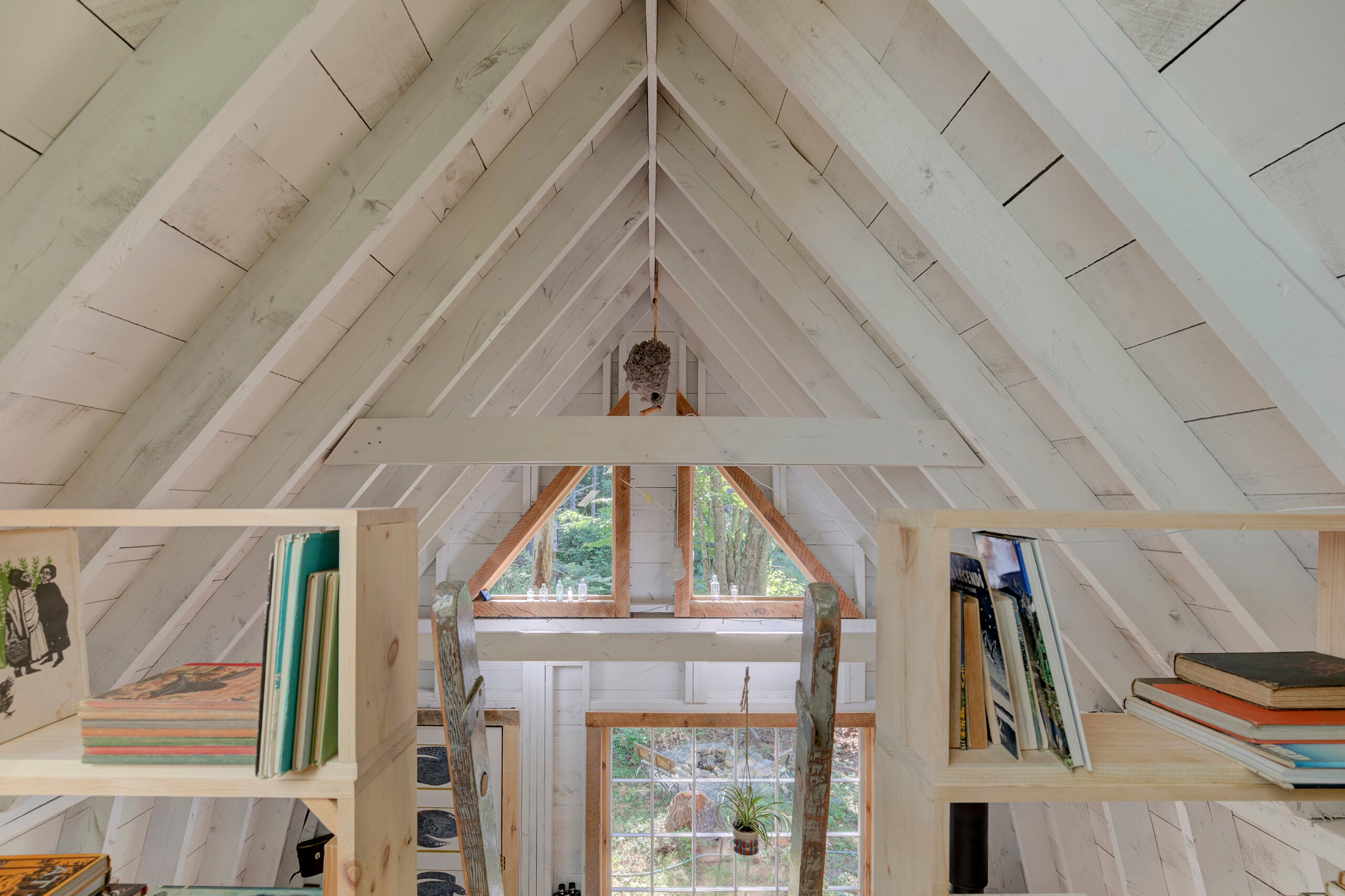 Climb the ladder to the lofted bedroom area, separated by built-in bookshelves. There, you’ll find the bedroom, which looks down over the rest of the space and features a queen-size bed. Wake up to the sun through an oversized skylight.