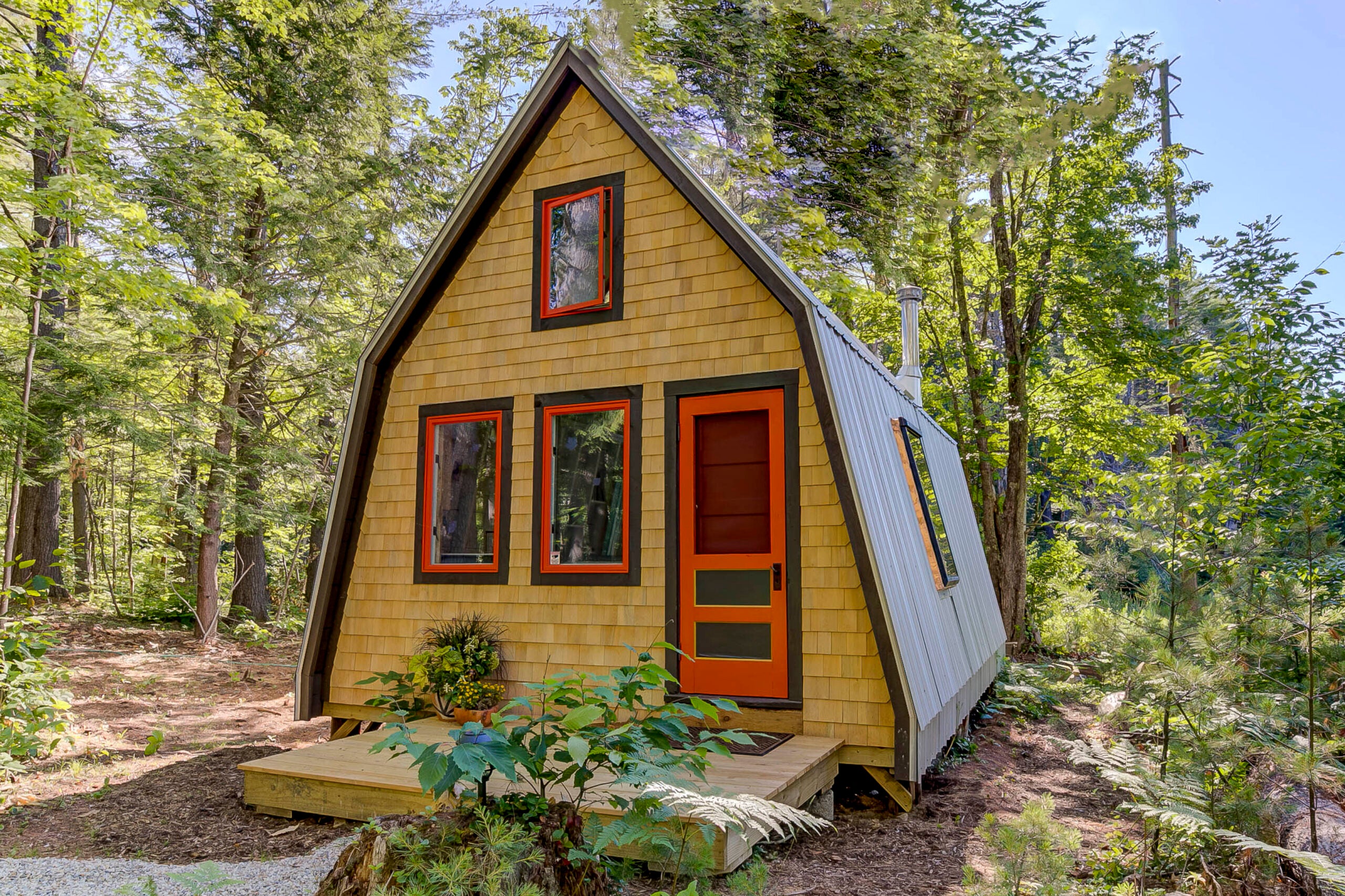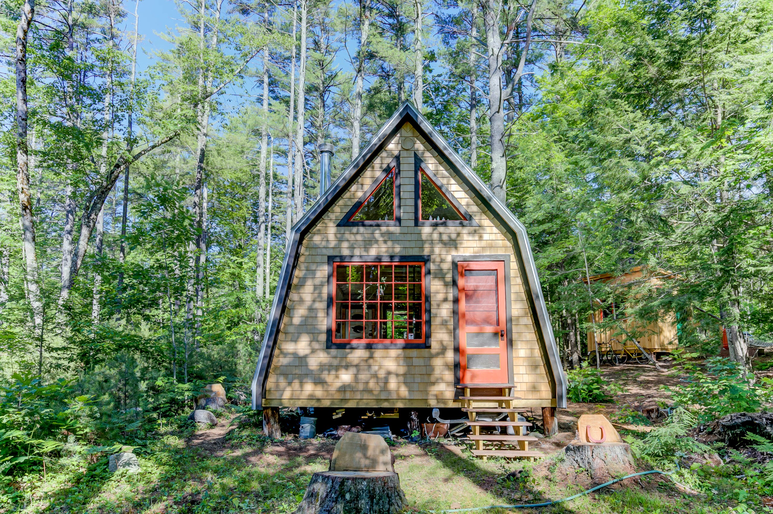 It may only measure 418 square feet on the inside, but this cozy Maine A-frame home comes with 10.8 acres of dreamy forest.