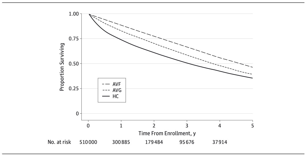 When kidneys stop cleaning the blood effectively, known as end-stage renal disease (ESRD), vascular access for dialysis becomes essential for patient survival and quality of life. There are several vascular access options available, including central venous catheters, arteriovenous (AV) fistulas, and AV grafts. Each option has its advantages and disadvantages, but AV fistulas are generally considered the gold standard due to their lower infection rates and better long-term outcomes. As shown in the figure, patients receiving fistulas demonstrate improved survival over 5 years.