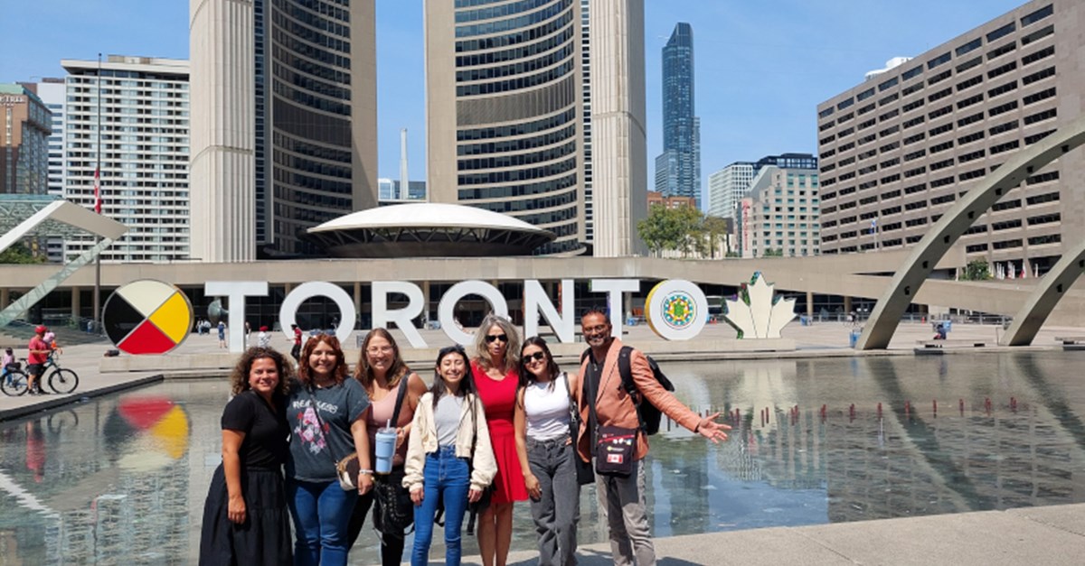 (Left to right) Kelly Silva, recruiter for Iamgold, Pamela Osorio Corales, Nikol Cubillos Fernandez, Francisca Puebla Careaga, Heather Gamble, co-founder and CEO of the Artemis Project, Priscilla Navarro, and Anesh Daya, president and founder of On the Spot Language. Courtesy of Artemisa Mining Challenge