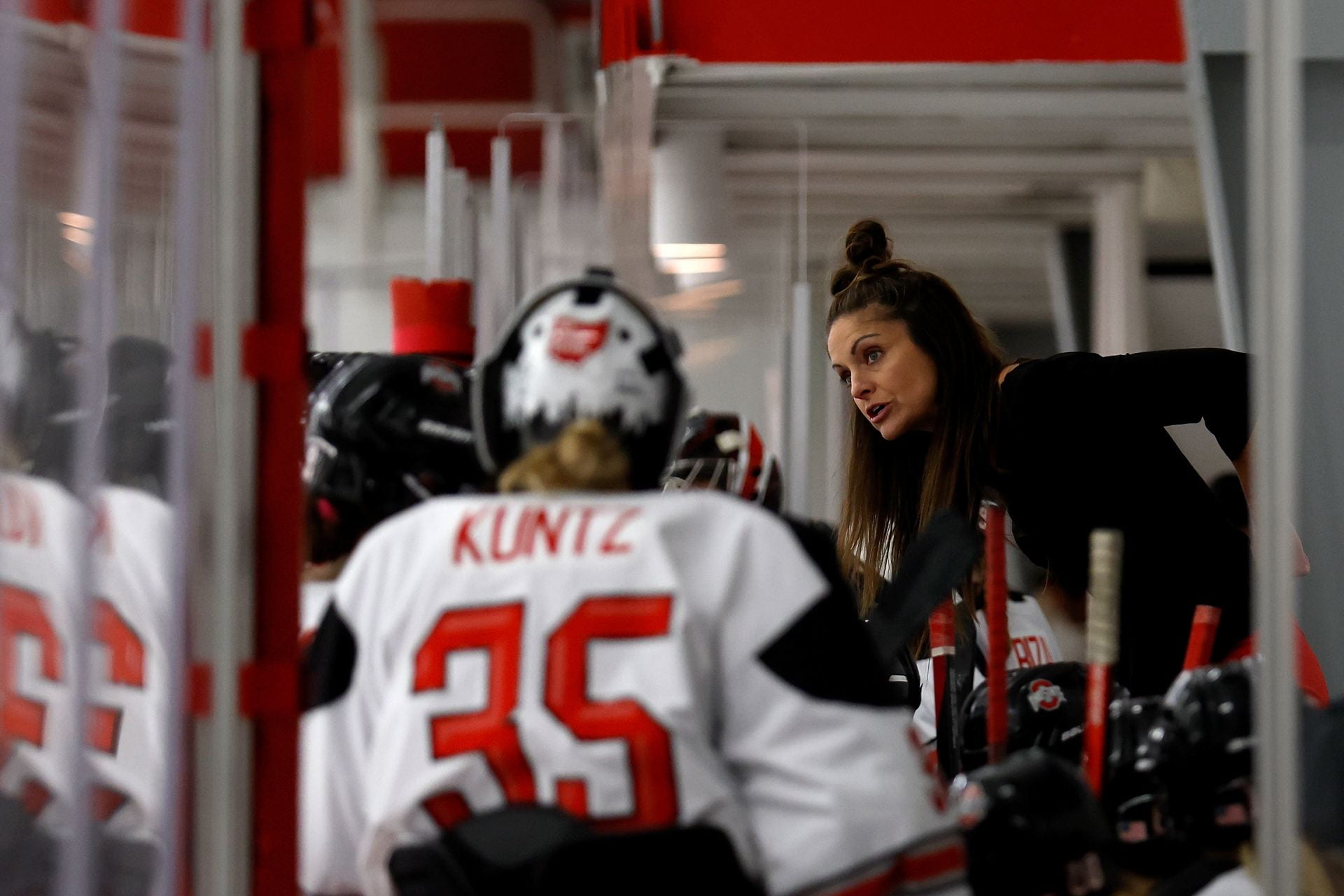 Head coach Nadine Muzerall speaks to the Ohio State women’s ice hockey team from the bench during a 6-5 win over Minnesota Oct. 28, 2023. Credit: Courtesy of Ohio State Athletics