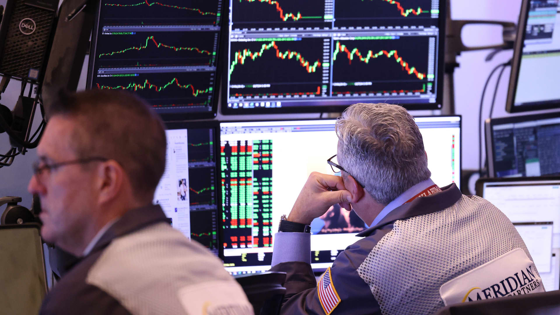 Traders work on the floor of the New York Stock Exchange during morning trading in New York City.