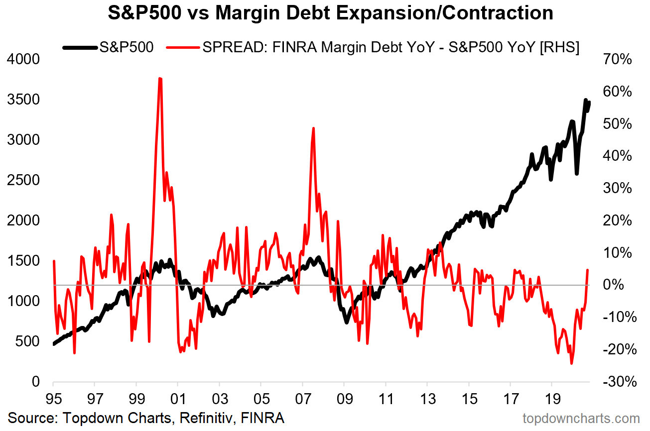 2. And here’s price-adjusted growth of margin debt… After a period of deleveraging, traders are piling back in. @topdowncharts brings us this chart of margin debt growth minus the S&P 500’s performance on a 1-year rolling basis, along with the S&P 500 in black. For those clamoring about how bearish it is that margin debt is spiking, well this one may cause them to hold their horses.