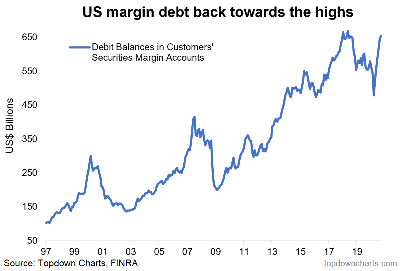 Some technicians consider margin debt to actually be a smart money indicator, meaning it is bullish as it breaks to new highs, but by simply looking at history, you can be your own technician and see that peaks in margin debt often coincide with peaks in the stock market. The chart below from Topdowncharts.com goes back to the late 1990s – the three market peaks are evident (though early 2020 did not set a new record high margin debt figure) while lows in margin debt happen at stock market bottoms. We find ourselves today venturing back toward the 2018 peak as traders turn more optimistic.