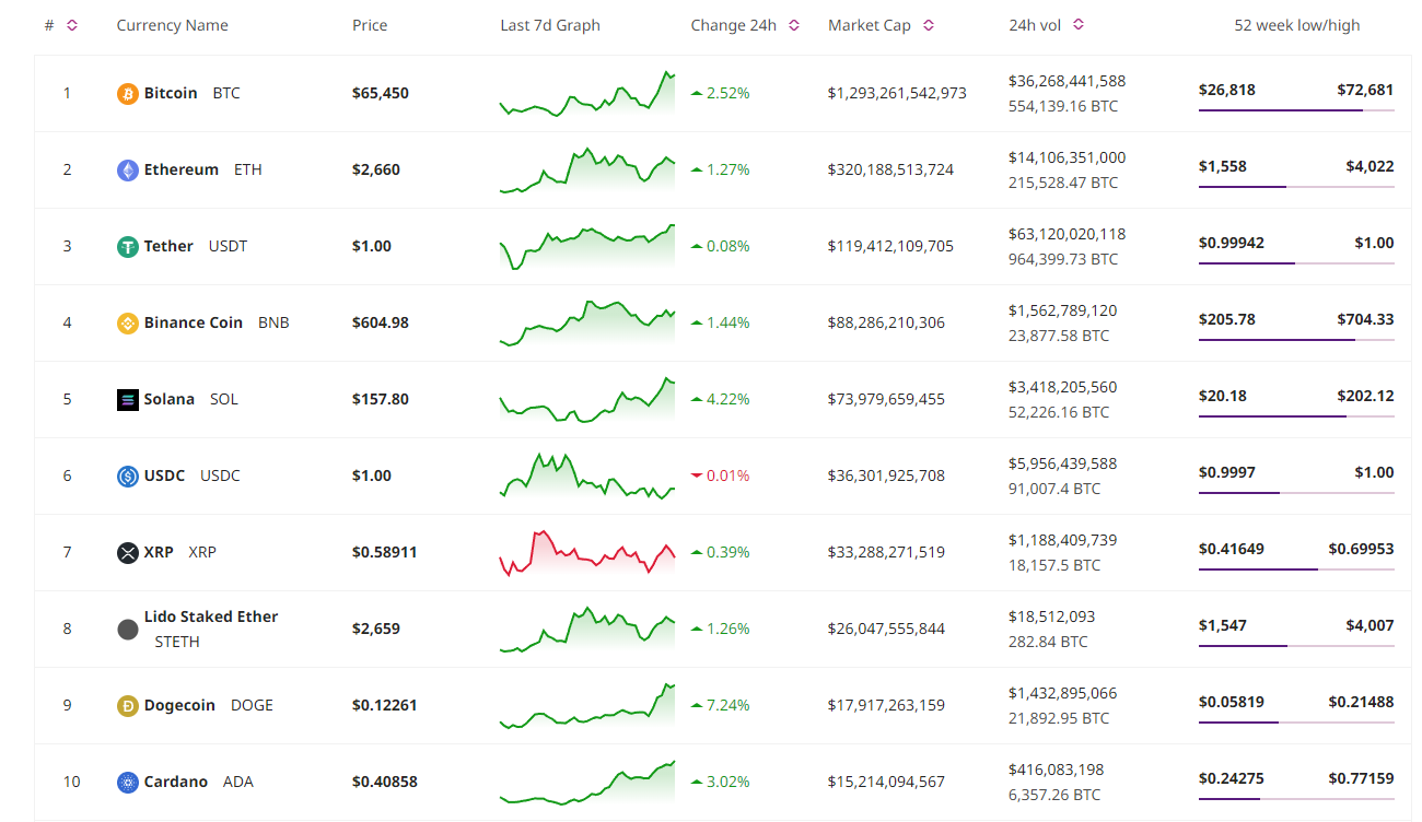 Bitcoin (BTC) recorded a 2.5% rise to $65,450, while Ethereum (ETH) increased by 1.3%, changing hands at $2,660.